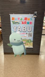 タペストリーにあるQRコードを読み込んで、進めていくと、「やっぷー」がカメラの中に動いて現れます。いっしょに記念撮影を撮ろう。但馬牛キャラクター「やぶっさん」もいっしょにいるよ。撮影場所はレストラン入口前。